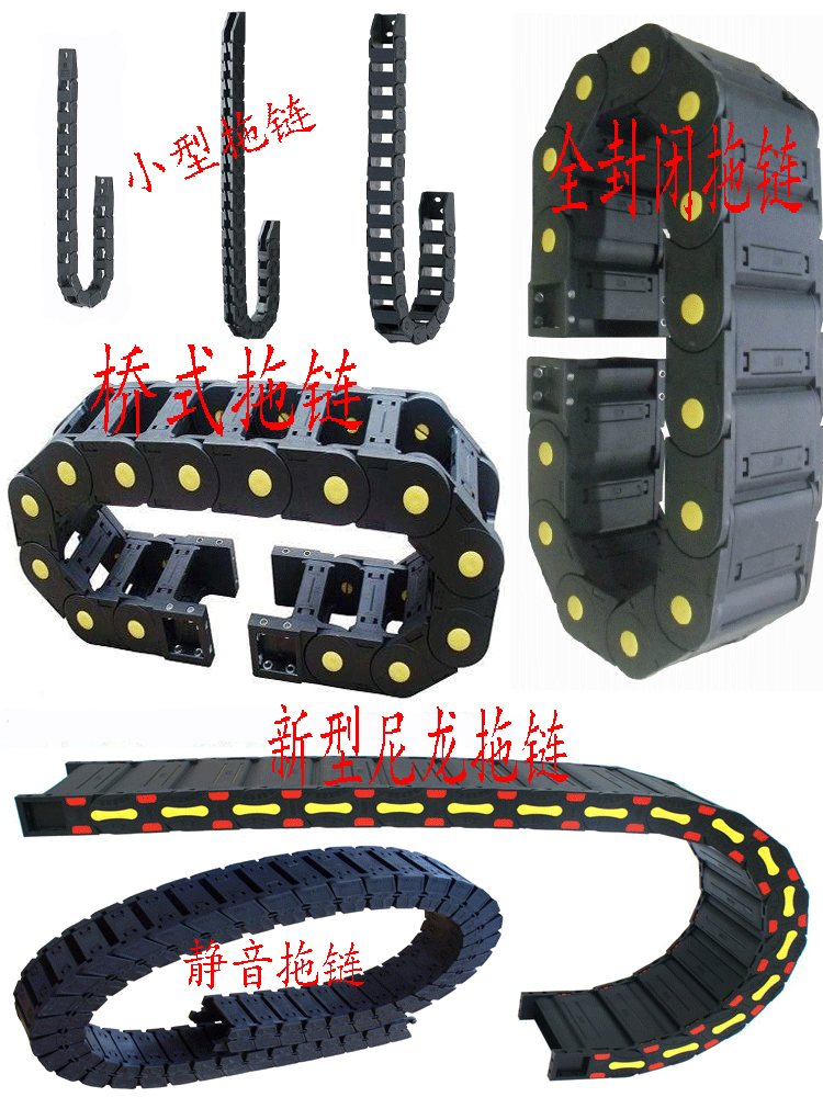 5.拖鏈已被廣泛用于數(shù)控機(jī)床,電子設(shè)備,消防機(jī)械設(shè)備,石材機(jī)械,玻璃機(jī)械,門窗機(jī)械,注塑機(jī),機(jī)械手,超重運(yùn)輸設(shè)備,自動(dòng)化倉(cāng)庫(kù)等。塑料拖鏈又稱工程拖鏈,坦克鏈。拖鏈根據(jù)使用環(huán)境和使用要求的不同分為橋式,全封閉,半封閉三種.